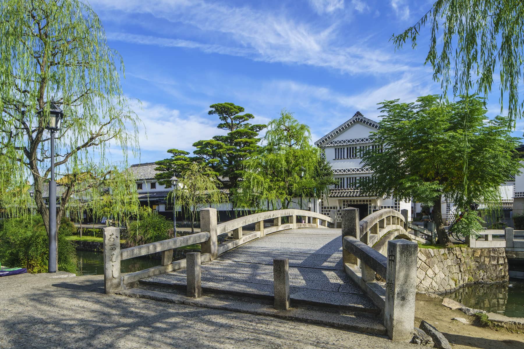倉敷美観地区では、白壁の蔵屋敷や柳並木など、情緒豊かな景観が広がっています。